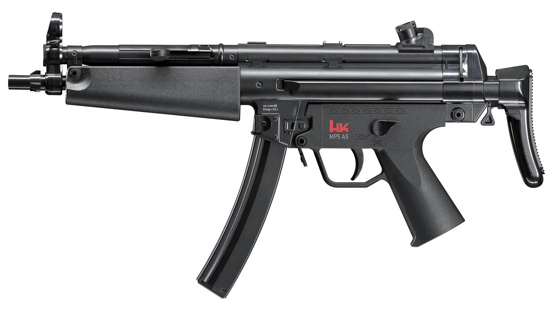 Heckler&Koch MP5 A5 je vybaven stavitelným hledím a systémem HOP-UP ovládaným posuvníkem z pravé strany zbraně.