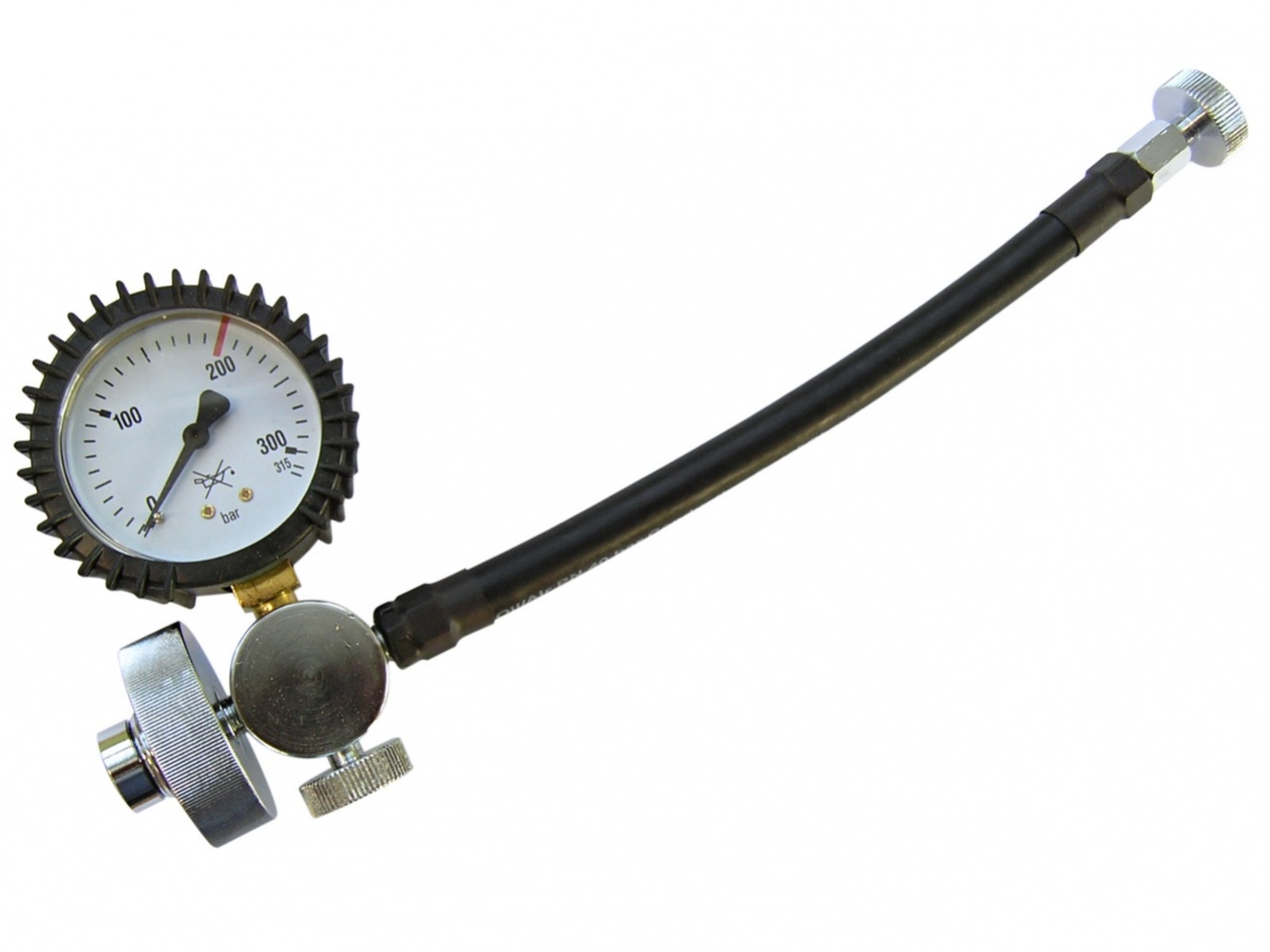 Hadice je opatřena konektorem DIN pro našroubování na láhev, manometrem pro kontrolu přepouštěného vzduchu a nezbytným odpouštěcím ventilem přebytěčného tlaku po naplnění.