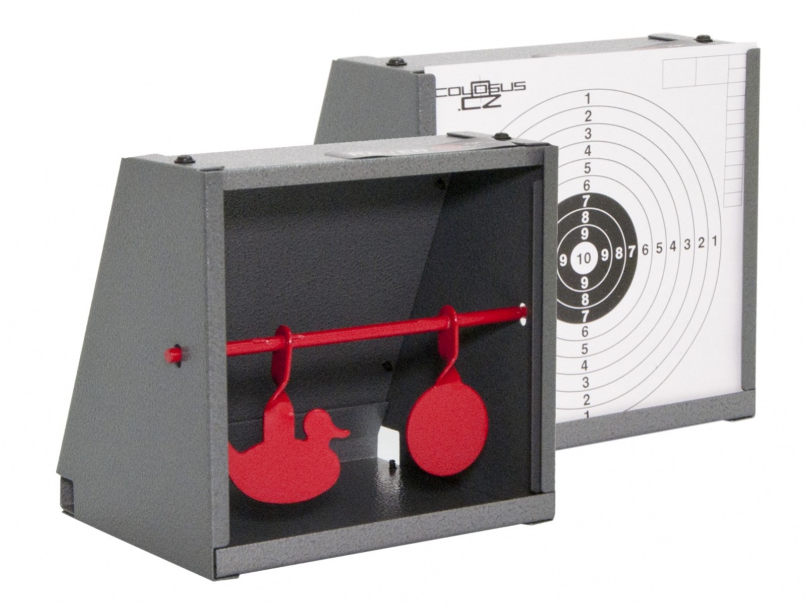 Smaltovaný plech kastlíkové konstrukce, vhodné i pro pušky do 16J, lapač lze využít pro terče 14x14cm a také jako střelnici na dva otočné cíle.