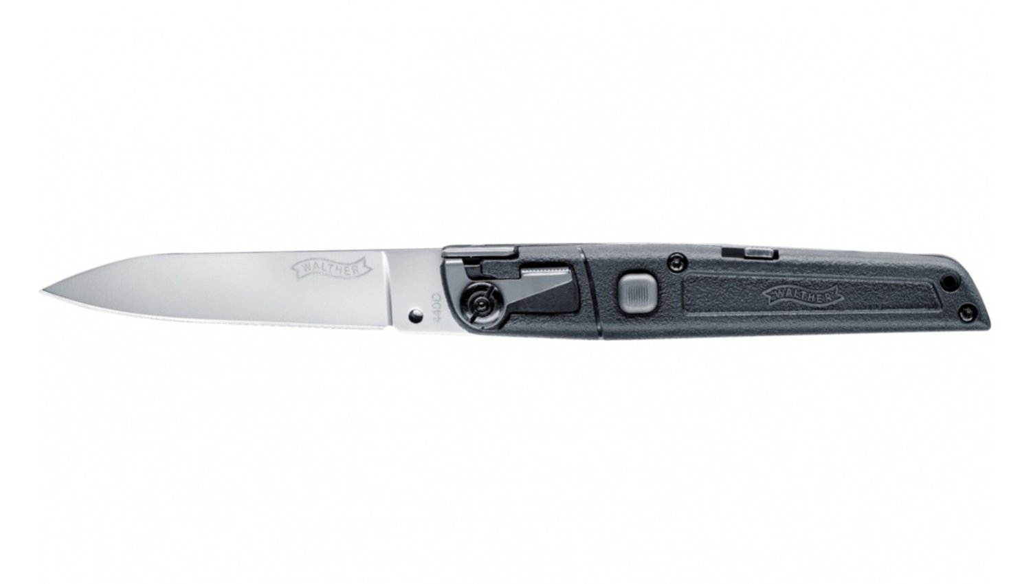Walther Spring Operated Knife 2, vystřelovací nože od firmy Walther, krátká štíhlá čepel 440C s hladkým ostřím, syntetická střenka rukojeti, pojistka vystřelování, pojistka sklopení čepele.