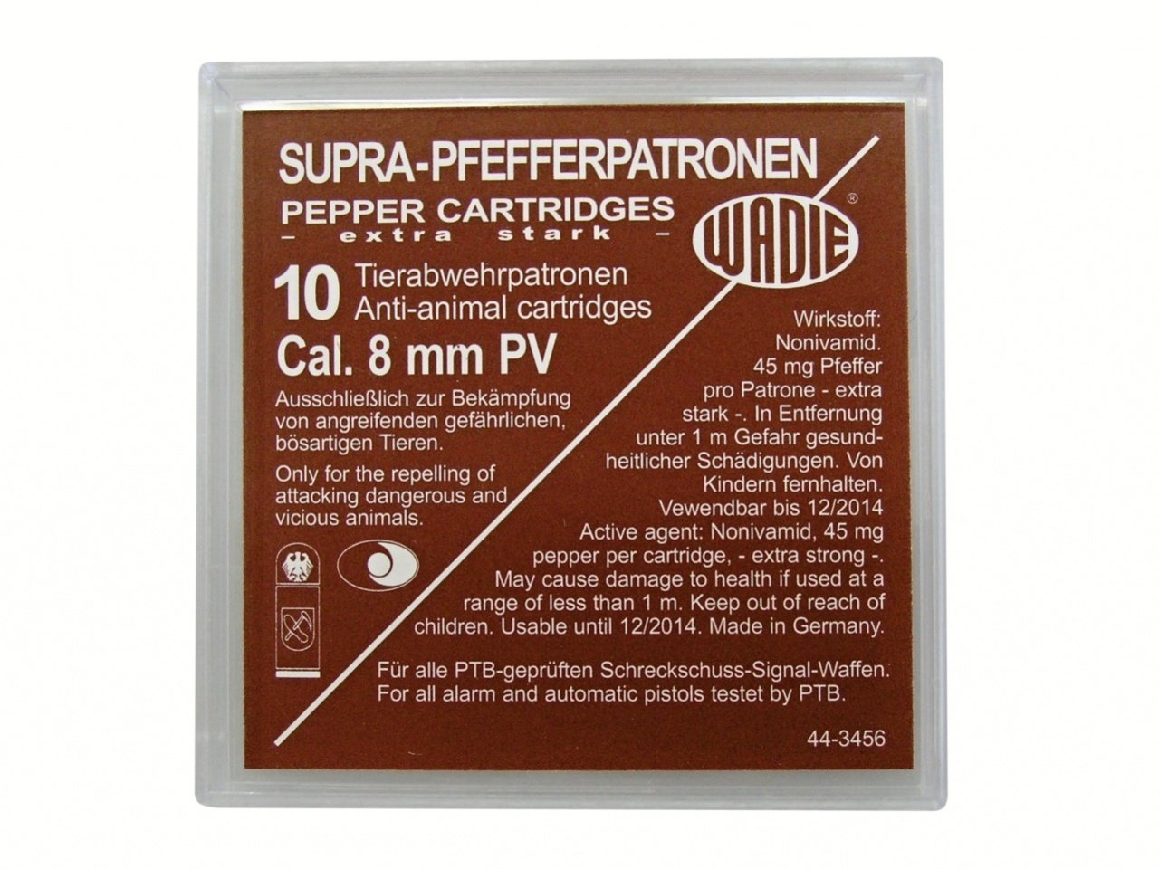 Náboje obsahují Nonivamid neboli technický pepř. Při zásahu je útočníkovi nevolno, špatně se mu dýchá, kašle, slzí, pálí ho oči, dokonce občas dojde ke kálení nebo močení. Nonivamid funguje i na zvířatech. Velkou výhodou je, že tyto pepřové náboje nepodléhají omezené trvanlivosti. Bohužel na narkomany nemusí působit tak účinně jako CS náboje. Proto je ideální mít v zásobníku kombinaci pepřových a CS nábojů.